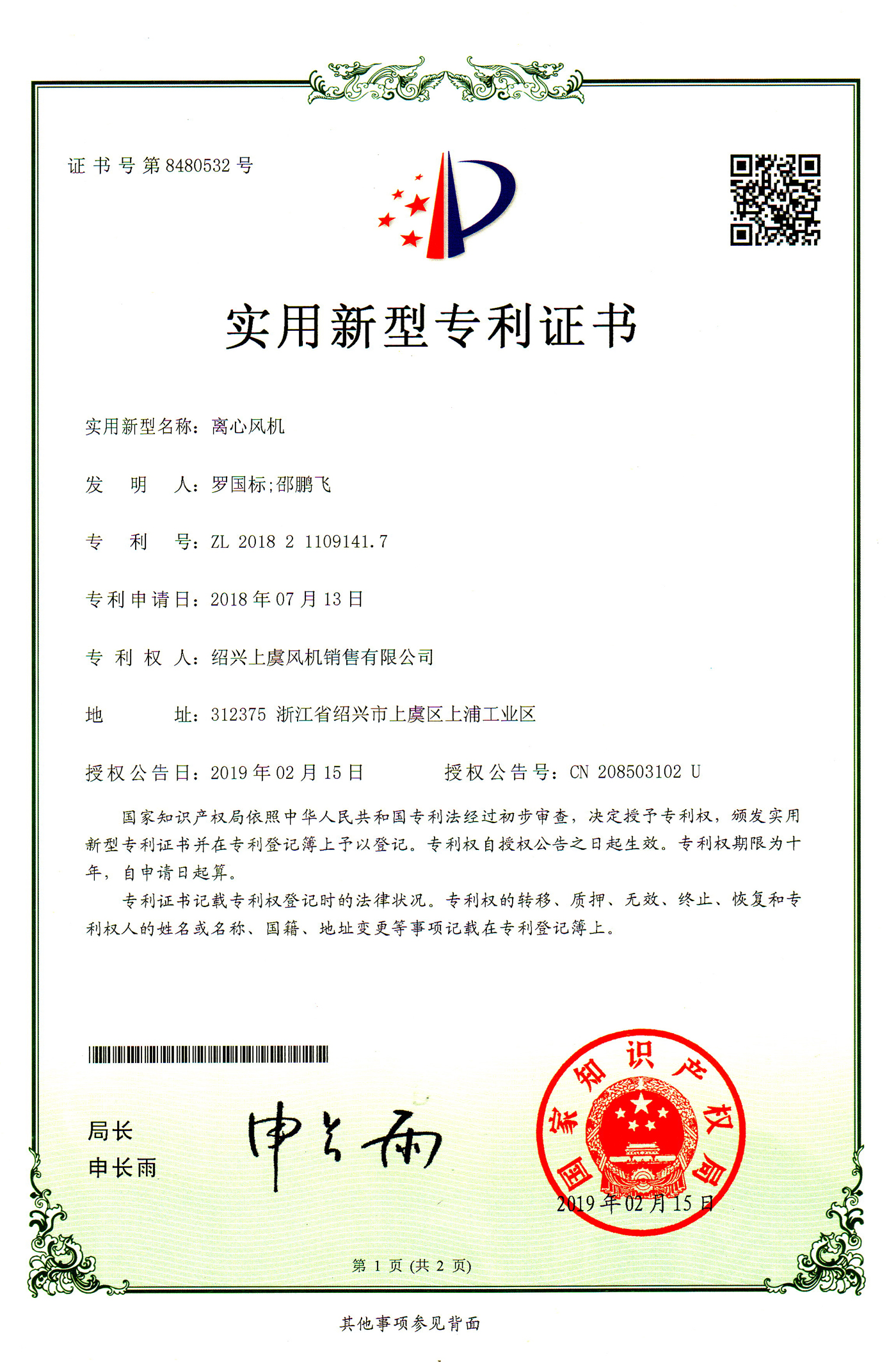 離心風(fēng)機專利證書 |